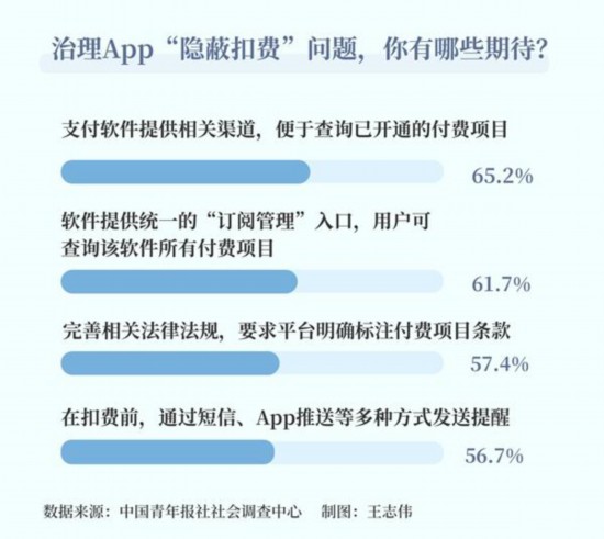 其他还有:在扣费前通过短信、App推送等明确提醒(56.7%),建立便捷的投诉举报渠道、对经核实的隐蔽扣费行为进行严厉处罚(41.1%),简化退款流程、提供更高效的申诉和退款通道(39.2%),针对老年人或未成年人账户,开通大额支付或连续订阅需额外验证(27.7%)等。
